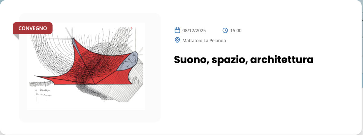 As part of the 62nd edition of the Festival of Nuova Consonanza, conferences on the general theme of “Suono, spazio, architettura” (Sound, Space, Architecture) will be held at Mattatoio La Pelanda on December 8, 2025, in Rome.